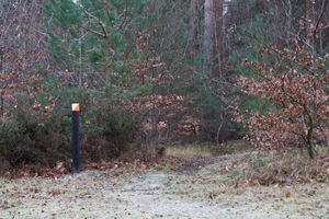 The controls are usually marked by small red-and-white squares, but sometimes smartphone QR codes are also included.  The markers are situated on posts, fences, etc - but not always visible from the normal line of approach!